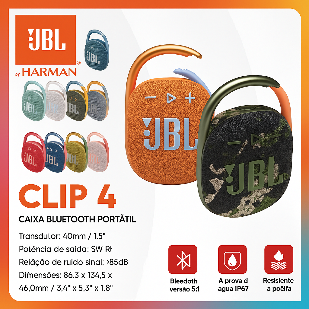 O Alto-Falante Subwoofer Portátil Original JBL Clip 4 é a combinação perfeita entre potência, praticidade e resistência. Com qualidade sonora premium e graves impressionantes, ele transforma qualquer ambiente em uma experiência sonora envolvente, seja em casa, na praia ou na trilha.