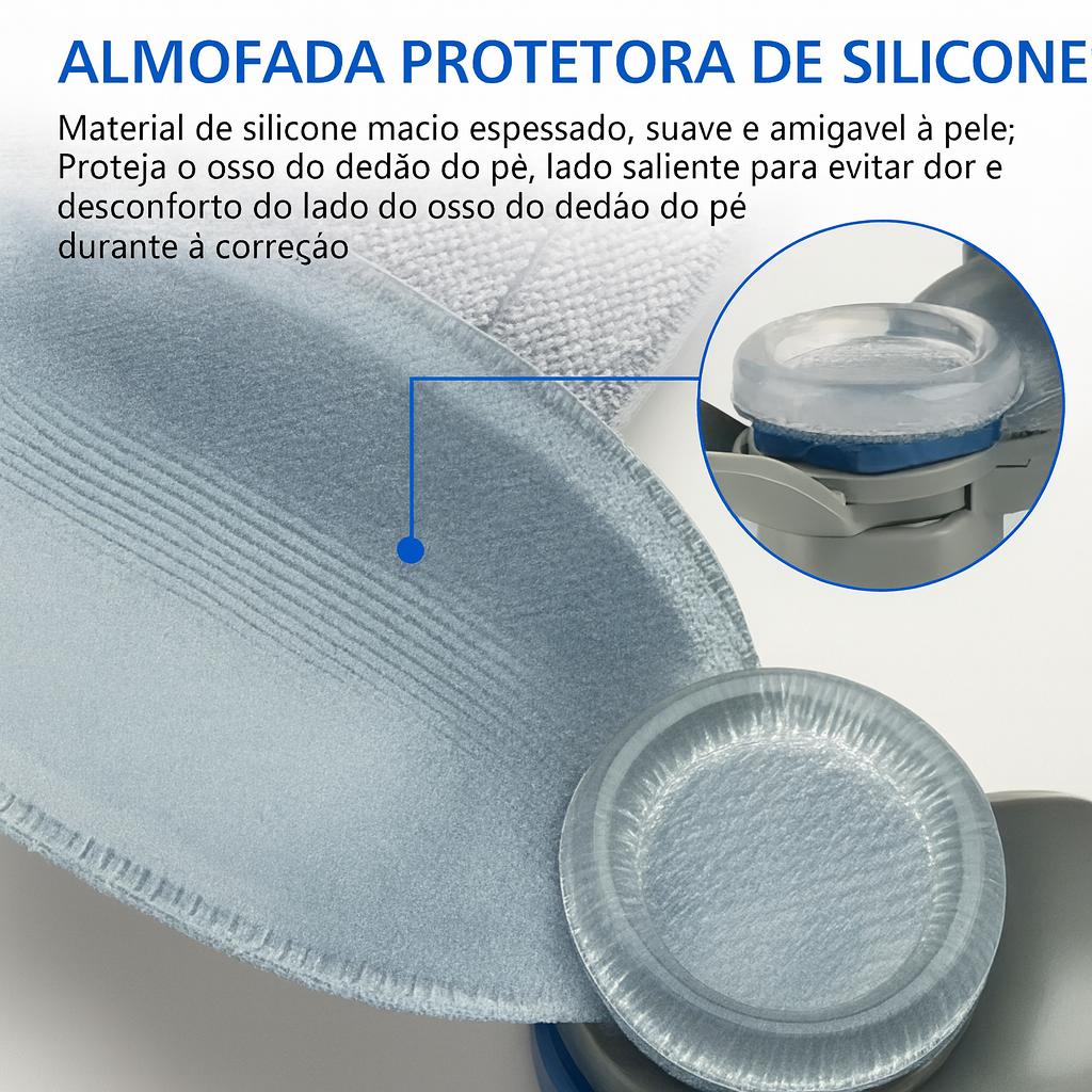 Diferente de corretores rígidos que machucam ainda mais, a almofada de silicone macia reduz a dor do joanete desde o primeiro uso. Ela cria uma camada de proteção que evita atrito, diminui a inflamação e traz alívio durante todo o processo de correção.