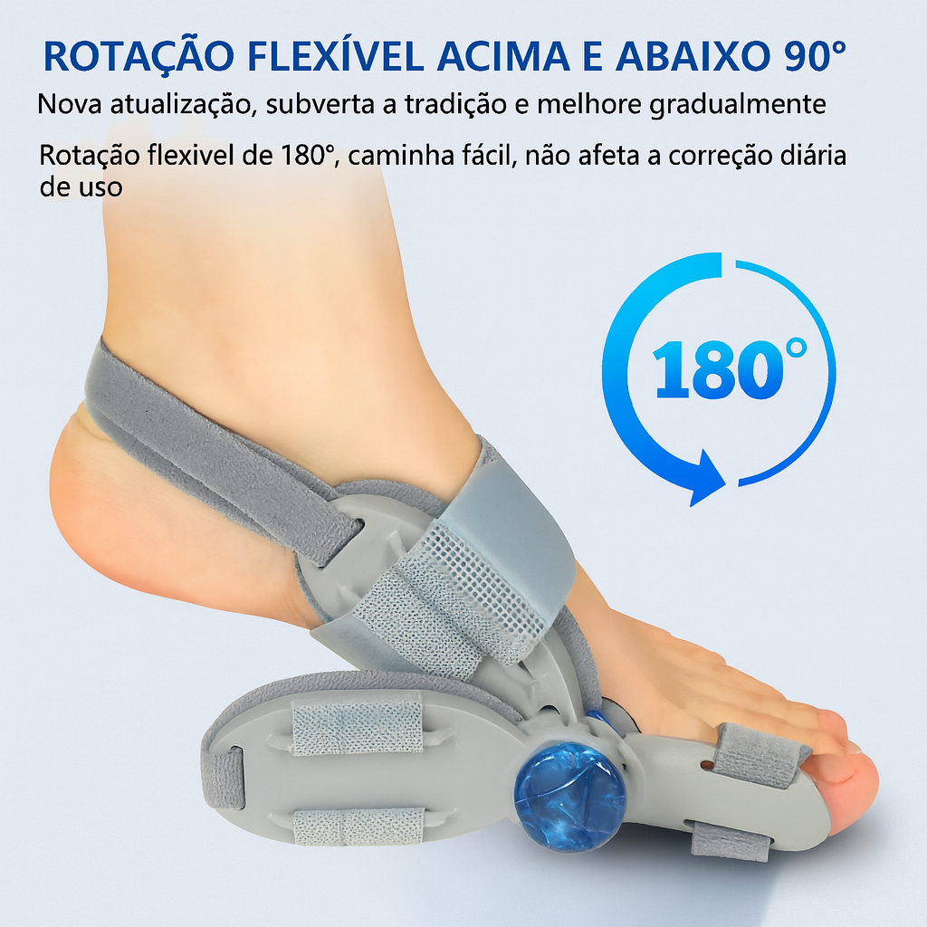 Com o sistema de botão rotativo de 180°, você controla exatamente o ângulo de correção necessário. Isso permite que o aparelho se adapte ao seu grau de joanete, realinhando o dedão com precisão e promovendo uma recuperação mais rápida e sem desconforto.