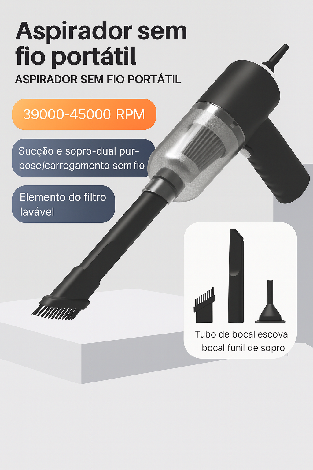Com ele, você não precisa mais gastar dinheiro com lava rápido ou ficar lutando com aspiradores grandes e pesados. Basta ligar e passar: limpeza instantânea, prática e completa no carro, escritório ou casa.