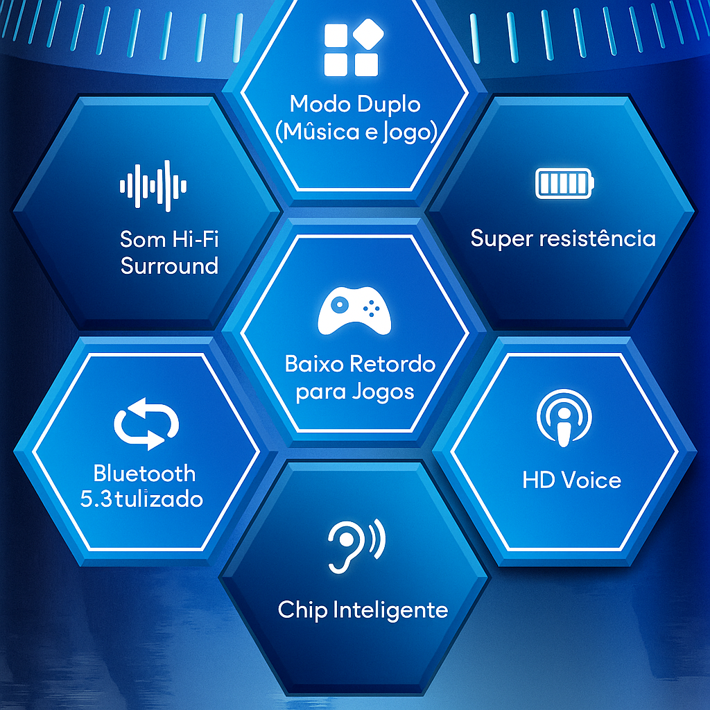 • Bluetooth 5.3 ultrarrápido: conexão estável e instantânea, sem quedas.