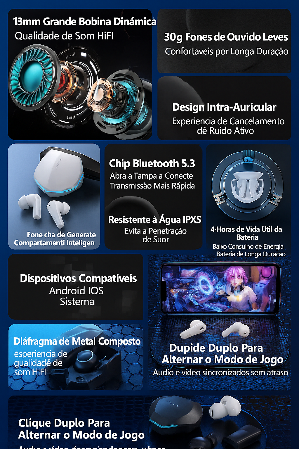 • Áudio imersivo e cristalino: curta cada detalhe sonoro com graves potentes e agudos equilibrados.