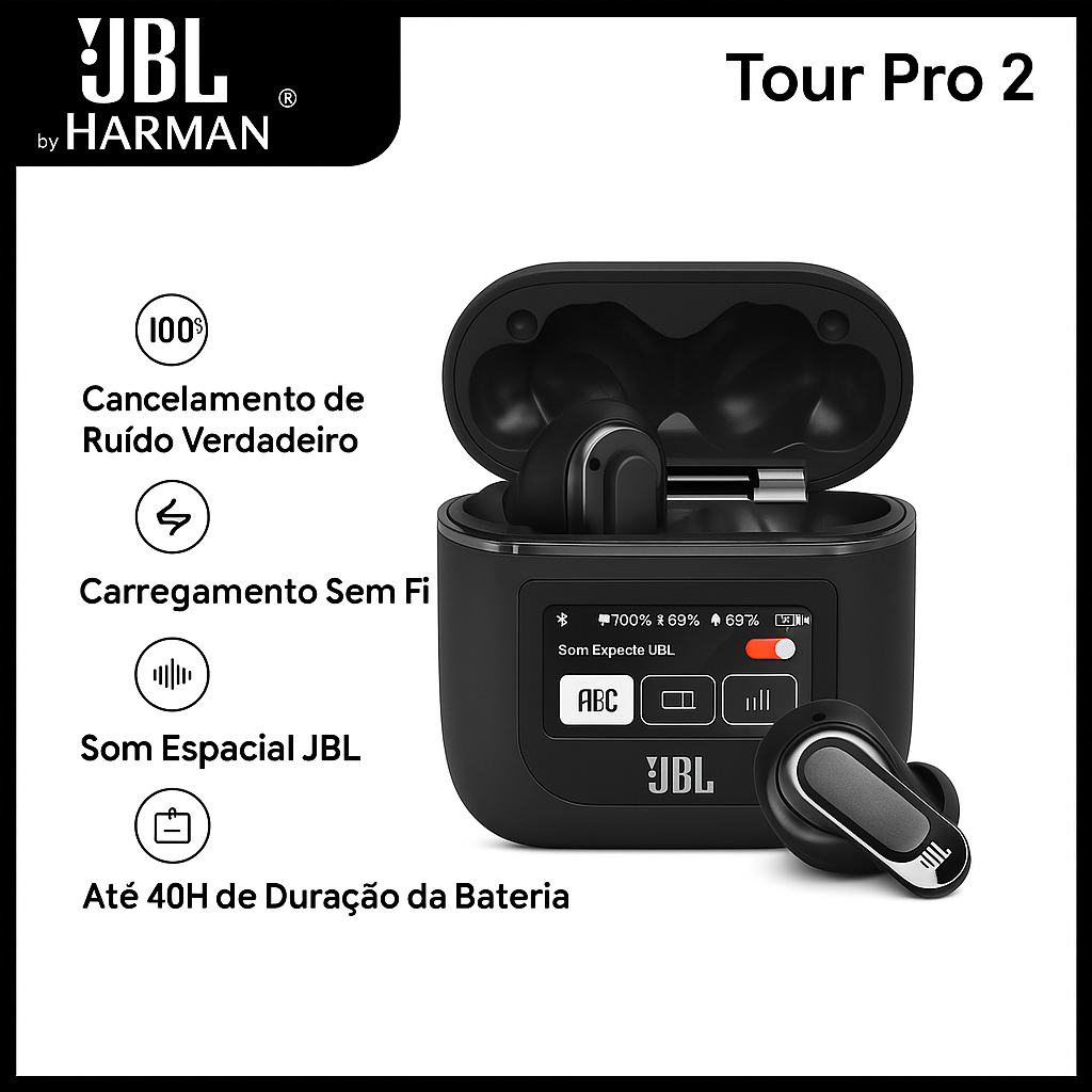 Além disso, o acabamento elegante e minimalista faz do JBL Tour Pro 2 um acessório de estilo tanto quanto de tecnologia.