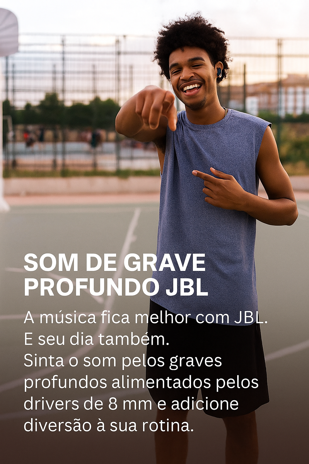 Sem fios, sem limites. O Bluetooth 5.0 conecta você ao seu mundo com rapidez e estabilidade, seja no treino, no trabalho ou em casa. Sinta-se livre para se movimentar e curtir o que realmente importa — o som de qualidade JBL.