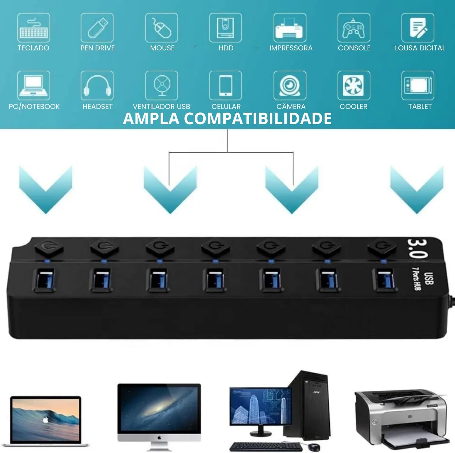 • Expansão real: transforme 1 porta USB em 7 completamente funcionais